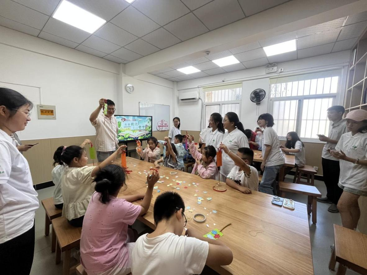 随后,上海路社区工作人员带领小朋友们动手DIY书签,孩子们通过裁剪、拼贴、绘画等方式,将卡纸、线绳等材料裁剪、搭配,不一会儿,各种原材料渐次化作形态各异的书签——或绘着星空宇宙,或缀以蝴蝶流苏,每一张都藏着童真对书籍的奇妙想象。在志愿者们的协助下,孩子们都制成了自己的专属书签?!拔乙厝ニ透杪瑁刻焱砩隙蓟岣医补适?,书签可以帮她记住看到哪一页!”朵朵小朋友开心地和小伙伴分享道。